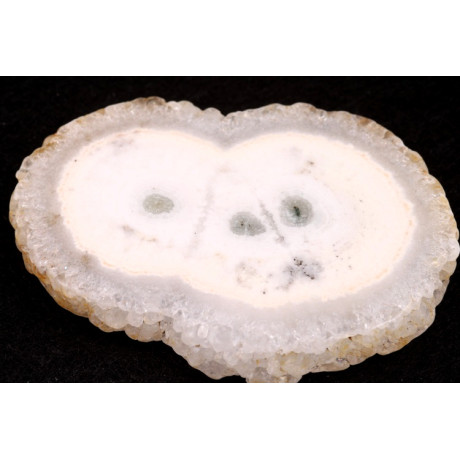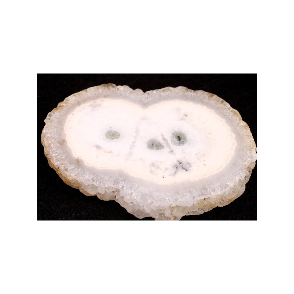 Kabošon z přírodního kamene Solar Quartz je jedinečným příkladem přírodní krásy a elegance. Tento minerál vzniká z křemenných krystalů, které se tvoří uvnitř geod a vytvářejí fascinující kruhové obrazy. Solar Quartz se často vyznačuje světle bílou až průsvitnou základní barvou, doplněnou jemnými inkluzemi, které mohou zahrnovat odstíny zelené, růžové či hnědé, což z něj činí klenot s jedinečnou barevnou strukturou. Právě tyto nepravidelné vzory a vrstvení mu dodávají zvláštní hloubku a přitažlivost.