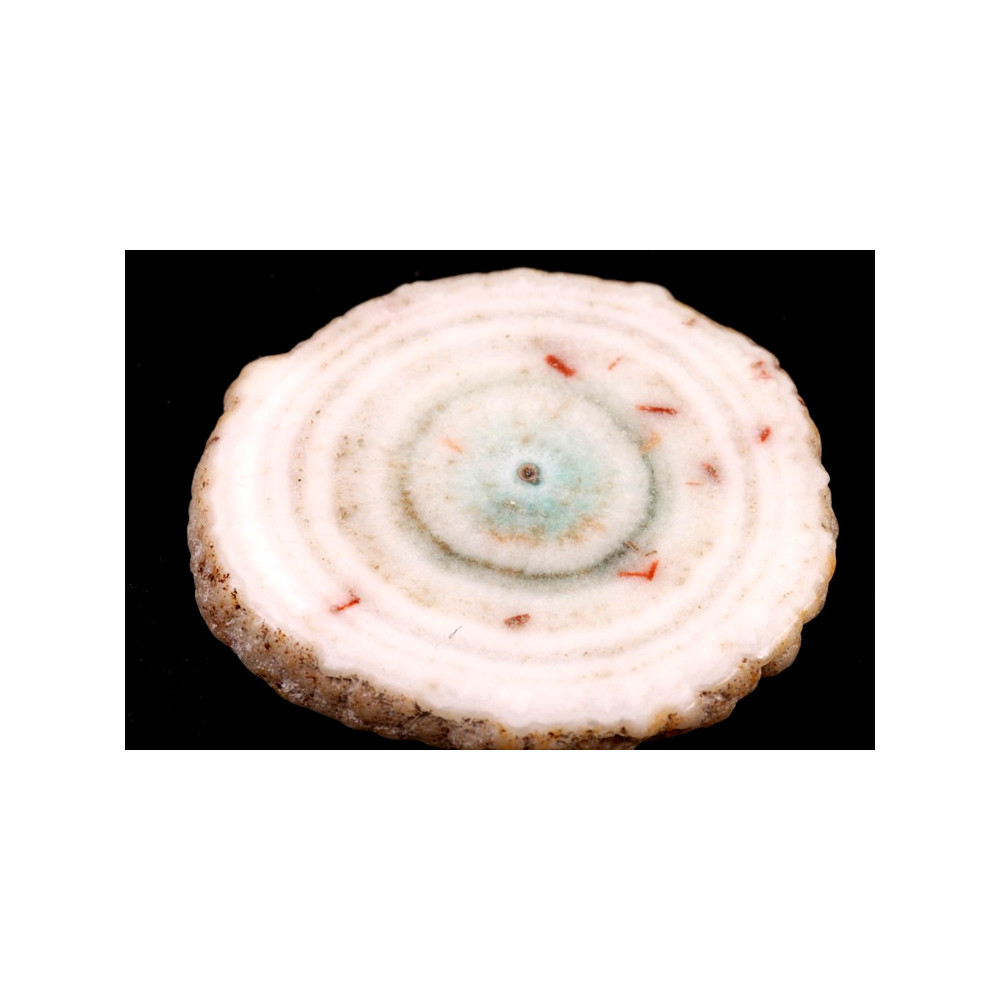 Kabošon z přírodního kamene Solar Quartz je jedinečným příkladem přírodní krásy a elegance. Tento minerál vzniká z křemenných krystalů, které se tvoří uvnitř geod a vytvářejí fascinující kruhové obrazy. Solar Quartz se často vyznačuje světle bílou až průsvitnou základní barvou, doplněnou jemnými inkluzemi, které mohou zahrnovat odstíny zelené, růžové či hnědé, což z něj činí klenot s jedinečnou barevnou strukturou. Právě tyto nepravidelné vzory a vrstvení mu dodávají zvláštní hloubku a přitažlivost.