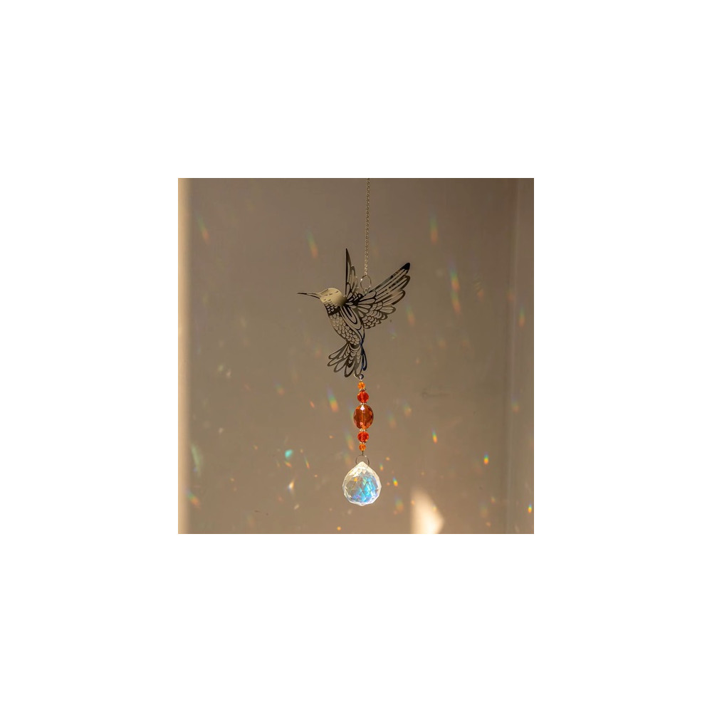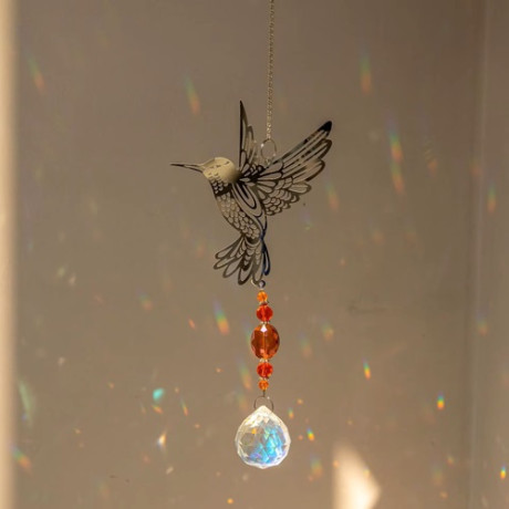 Kouzelný lapač slunce s motivem kolibříka. Kombinace uměleckého kovu a třpytivých skleněných křišťálů vytváří úchvatnou hru světel. Ideální dekorace do oken, na terasu či do zahrady