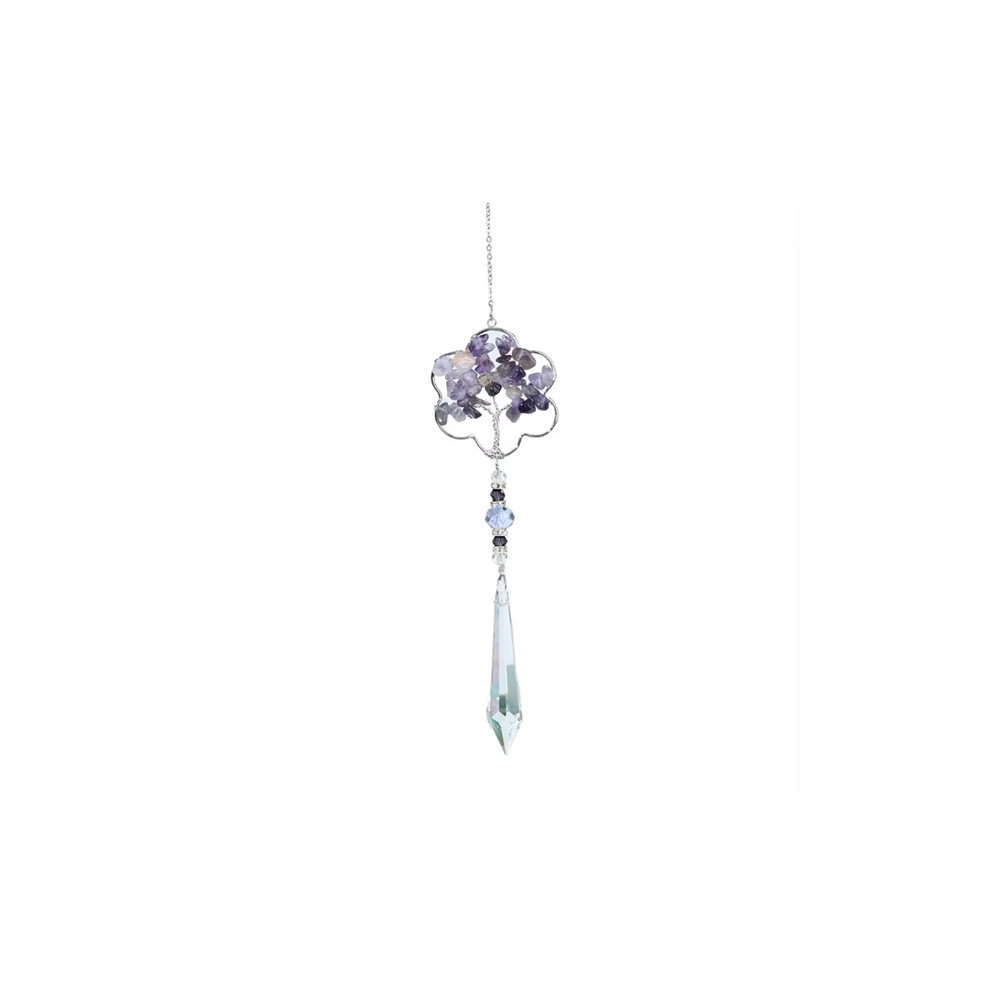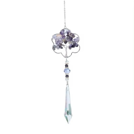 Každý lapač je doplněn broušeným křišťálovým přívěskem, který umocňuje hru světla a vytváří fascinující duhové efekty. Jemné skleněné korálky v odstínech fialové dodávají celé kompozici elegantní nádech.
