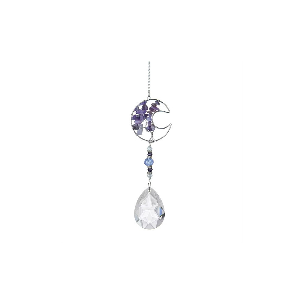 Každý lapač je doplněn broušeným křišťálovým přívěskem, který umocňuje hru světla a vytváří fascinující duhové efekty. Jemné skleněné korálky v odstínech fialové dodávají celé kompozici elegantní nádech.