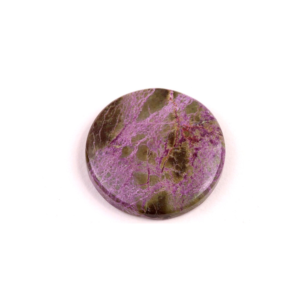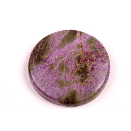 Kabošon z přírodního kamene Stichtit je fascinující příklad minerálu s výraznou fialovou barvou, která vzniká díky přirozenému složení magnézia a chromu. Tento kámen, často nalezený v kombinaci s dalšími minerály jako je serpentin, vytváří působivý vizuální kontrast s hlubokými odstíny purpurové až fialové a jemně zelenými či bílými žilkami. Stichtit je minerál s historickým původem sahajícím do Tasmánie, kde byl poprvé objeven koncem 19. století a pojmenován podle Williama Stichty, jednoho z významných geologů té doby.