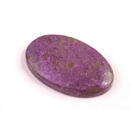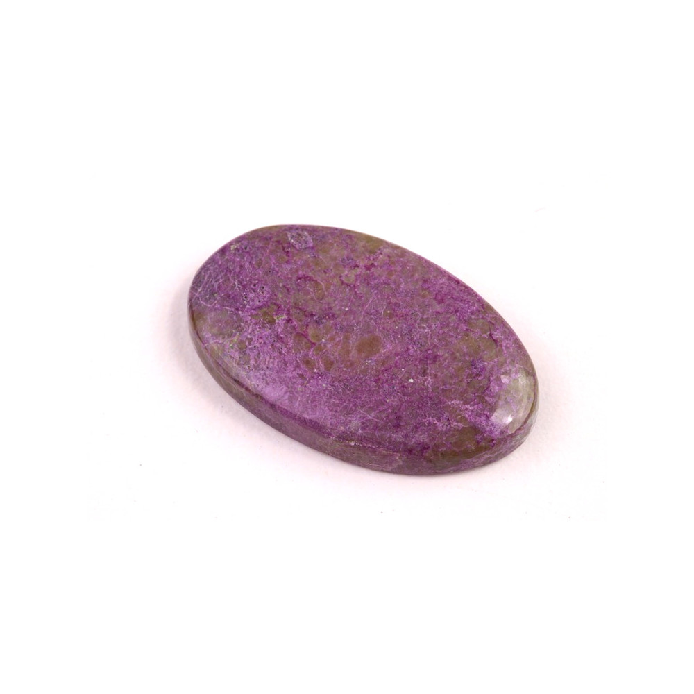 Kabošon z přírodního kamene Stichtit je fascinující příklad minerálu s výraznou fialovou barvou, která vzniká díky přirozenému složení magnézia a chromu. Tento kámen, často nalezený v kombinaci s dalšími minerály jako je serpentin, vytváří působivý vizuální kontrast s hlubokými odstíny purpurové až fialové a jemně zelenými či bílými žilkami. Stichtit je minerál s historickým původem sahajícím do Tasmánie, kde byl poprvé objeven koncem 19. století a pojmenován podle Williama Stichty, jednoho z významných geologů té doby.