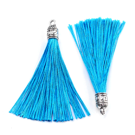 Elegantní střapec s kovovým kaplíkem ve starostříbrné barvě pro zdobení šperků, oděvů a dekorací. Na konci je připevněn ozdobný kovový kaplík s očkem pro uchycení.