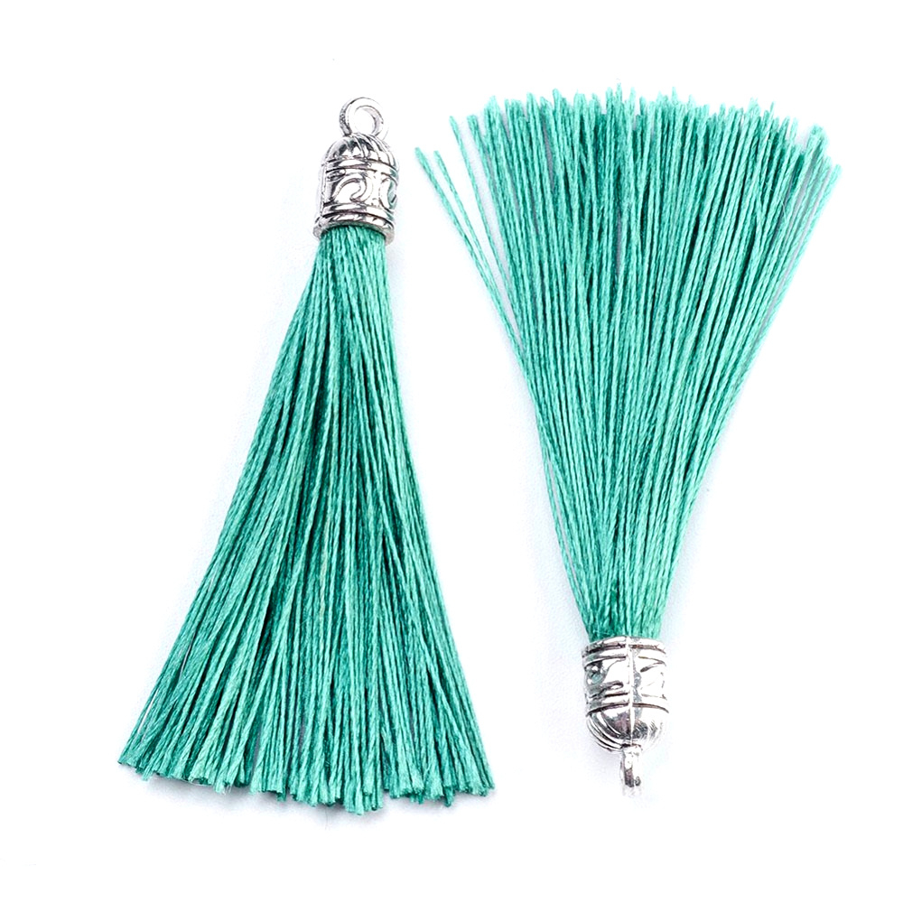 Elegantní střapec s kovovým kaplíkem ve starostříbrné barvě pro zdobení šperků, oděvů a dekorací. Na konci je připevněn ozdobný kovový kaplík s očkem pro uchycení.