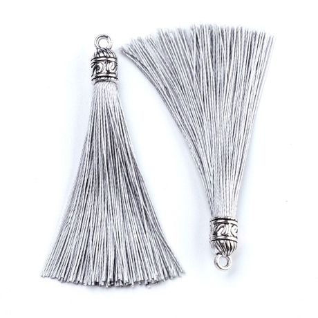 Elegantní střapec s kovovým kaplíkem ve starostříbrné barvě pro zdobení šperků, oděvů a dekorací. Na konci je připevněn ozdobný kovový kaplík s očkem pro uchycení.