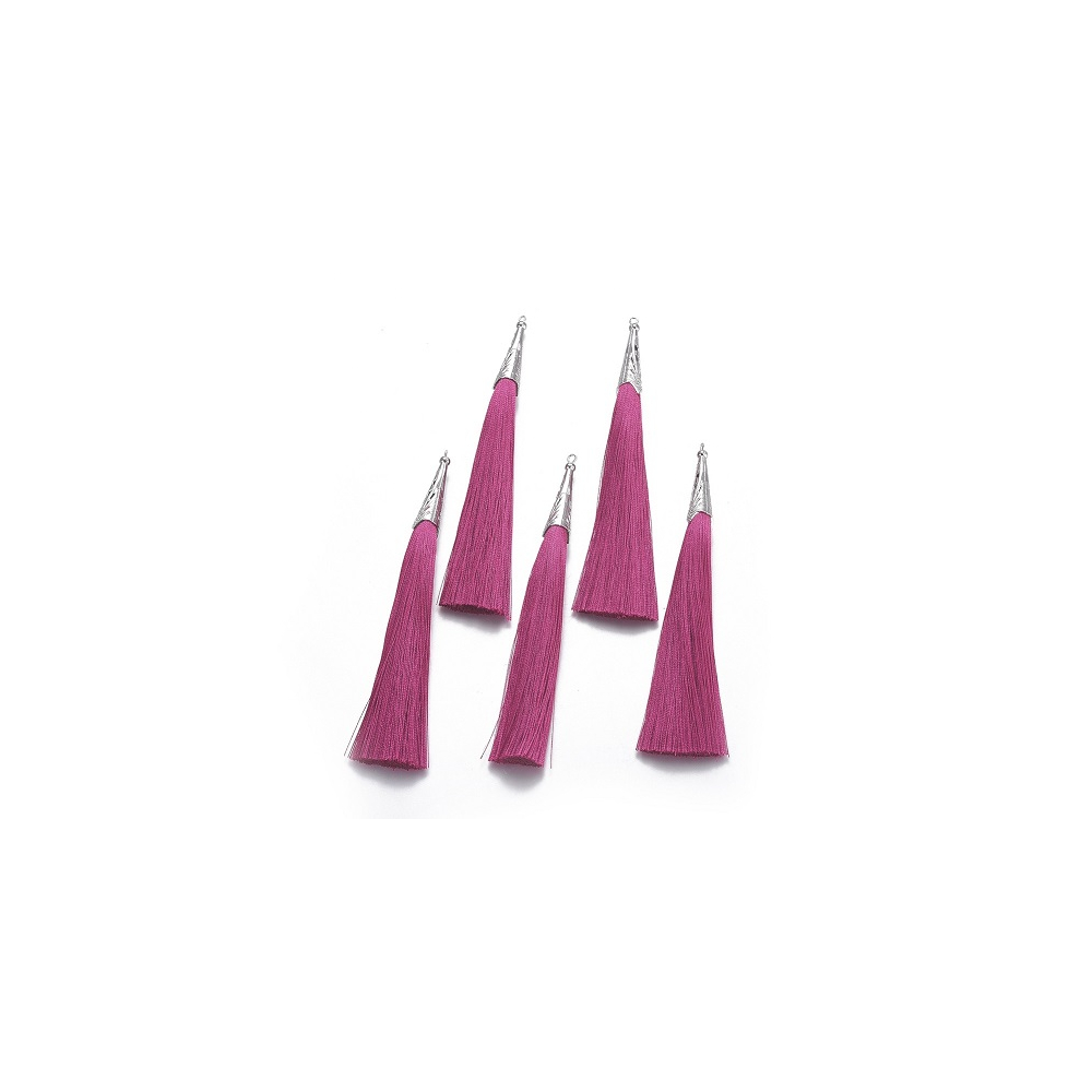 Elegantní stříbrný dlouhý střapec s dekorativním kovovým špičatým kaplíkem.