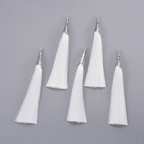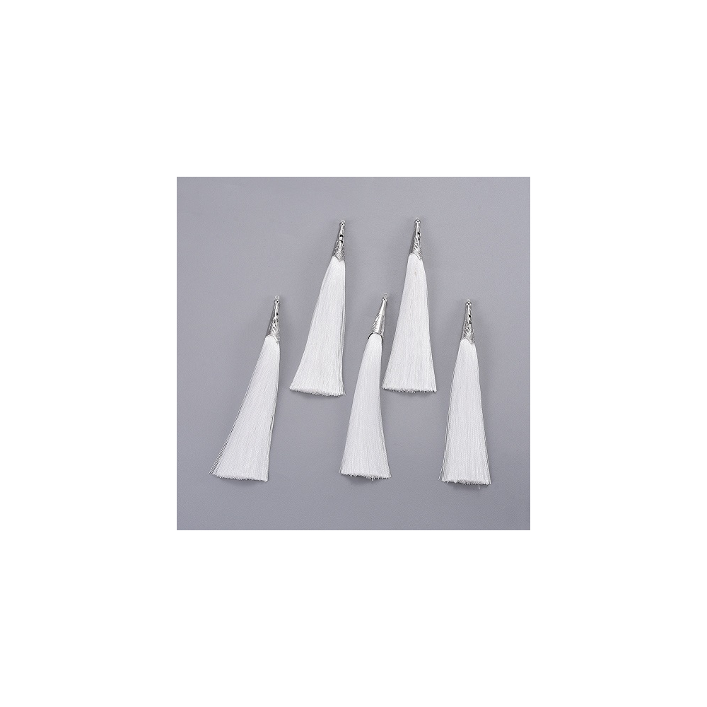 Elegantní stříbrný dlouhý střapec s dekorativním kovovým špičatým kaplíkem.