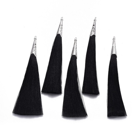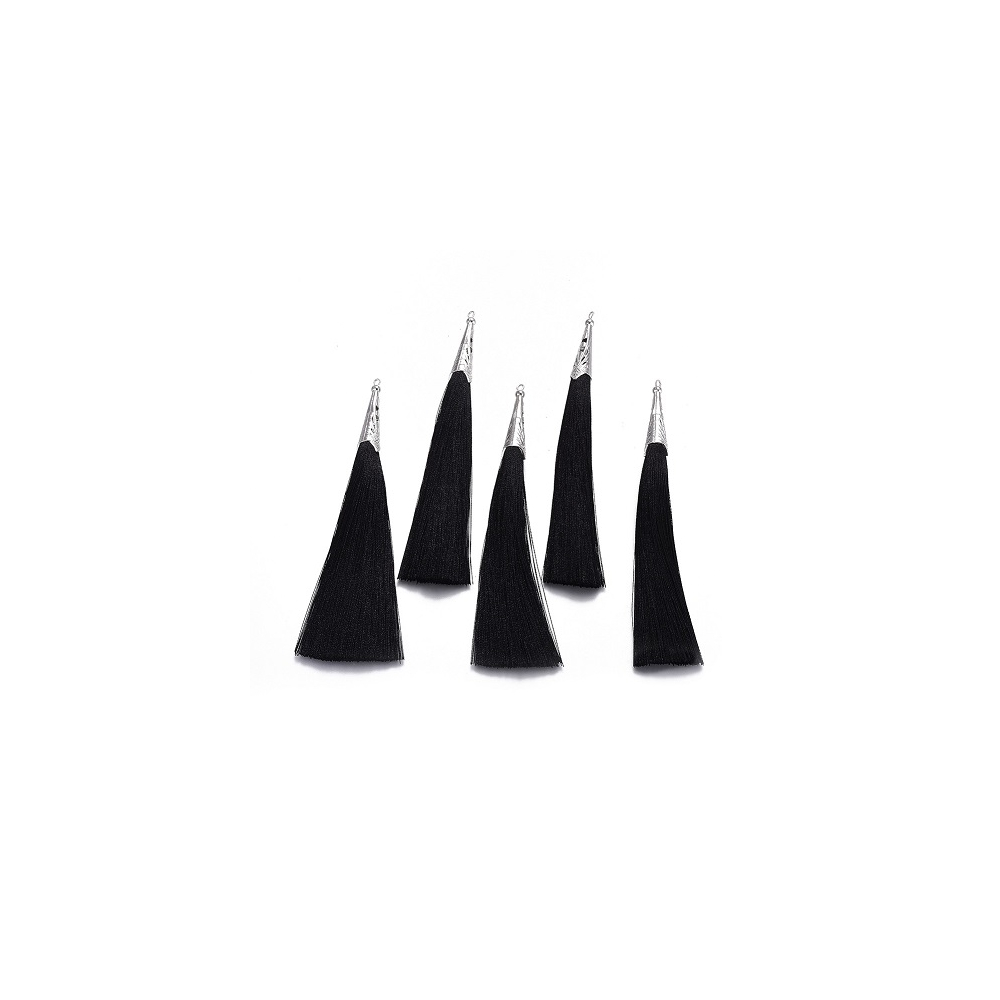 Elegantní stříbrný dlouhý střapec s dekorativním kovovým špičatým kaplíkem.