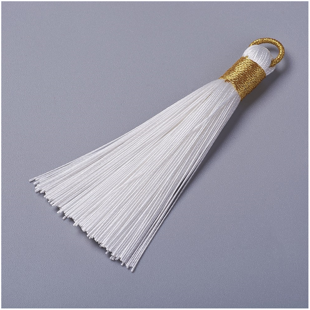 Střapec z nylonových šňůr je ideální doplněk pro vaše šperky. Je vyroben z kvalitních materiálů. Střapec je dlouhý přibližně 6,5 cm. Je opatřen zlatým očkem, které umožňuje snadné uchycení na náhrdelník nebo náušnice. Střapec je na konci ozdobně stažen nití ve zlaté barvě.