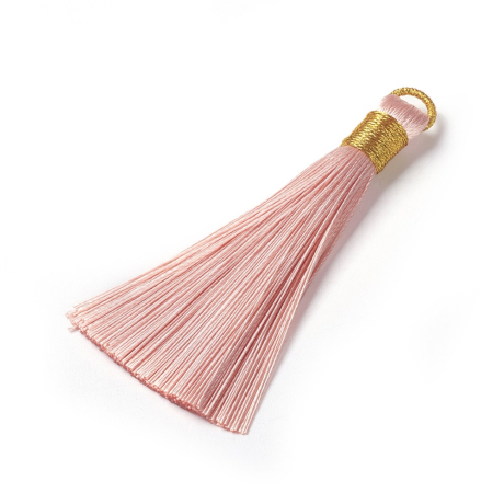 Střapec z nylonových šňůr je ideální doplněk pro vaše šperky. Je vyroben z kvalitních materiálů. Střapec je dlouhý přibližně 6,5 cm. Je opatřen zlatým očkem, které umožňuje snadné uchycení na náhrdelník nebo náušnice. Střapec je na konci ozdobně stažen nití ve zlaté barvě.