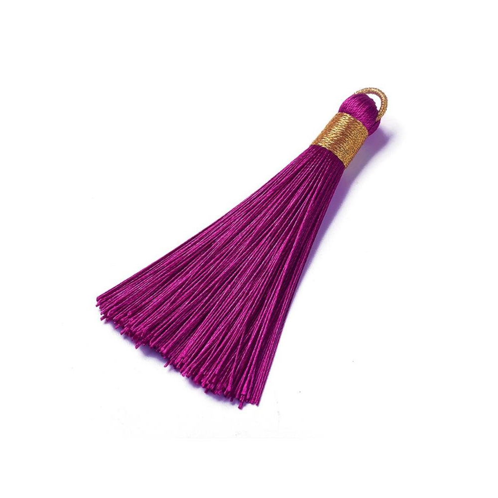 Střapec z nylonových šňůr je ideální doplněk pro vaše šperky. Je vyroben z kvalitních materiálů. Střapec je dlouhý přibližně 6,5 cm. Je opatřen zlatým očkem, které umožňuje snadné uchycení na náhrdelník nebo náušnice. Střapec je na konci ozdobně stažen nití ve zlaté barvě.