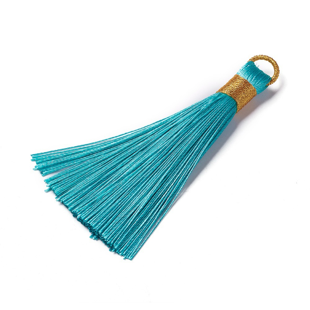Střapec z nylonových šňůr je ideální doplněk pro vaše šperky. Je vyroben z kvalitních materiálů. Střapec je dlouhý přibližně 6,5 cm. Je opatřen zlatým očkem, které umožňuje snadné uchycení na náhrdelník nebo náušnice. Střapec je na konci ozdobně stažen nití ve zlaté barvě.
