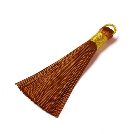 Střapec z nylonových šňůr je ideální doplněk pro vaše šperky. Je vyroben z kvalitních materiálů. Střapec je dlouhý přibližně 6,5 cm. Je opatřen zlatým očkem, které umožňuje snadné uchycení na náhrdelník nebo náušnice. Střapec je na konci ozdobně stažen nití ve zlaté barvě.