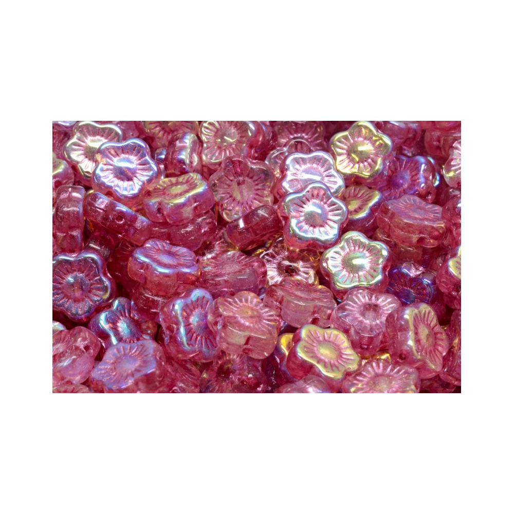 Růžové skleněná hmota s výrazným duhovým odleskem vdechne život každému kreativnímu projektu, který vyžaduje jemnost a detail. Korálky květ Slunečnice vynikají precizním lisovaným reliéfem s motivem okvětních lístků, které v kombinaci s povrchovou úpravou AB vytvářejí měňavé barevné efekty při každém dopadu světla. Minimalistický design kytiček působí ve šperku velmi lehce a díky lesklému povrchu dodává výslednému dílu nádech luxusu.