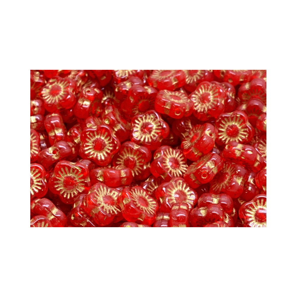 Červená barva se zlatým akcentem zdobí tyto české skleněné korálky ve tvaru kytičky. Jejich design vychází z tradiční české mačkářské školy výrobce Rutkovsky a vyniká precizním zpracováním detailů.