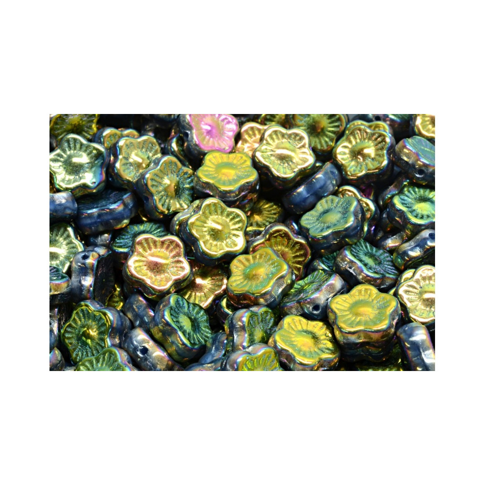 Zelená barva s výraznými iridiscentními odlesky zdobí tyto Sunset Flower Beads 10 x 10 mm z dílny českého výrobce Rutkovsky. Skleněné korálky květ Slunečnice o rozměru 10 x 10 mm nabízejí detailní reliéf, který v kombinaci se stříbrnými akcenty vytvoří luxusní dojem. Při tvorbě náhrdelníků nebo náramků se skvěle doplňují s menšími prvky, jako jsou skleněné kuličky, přičemž nejlépe ladí s harmonickou tyrkysovou nebo kontrastní ametystově fialovou barvou.