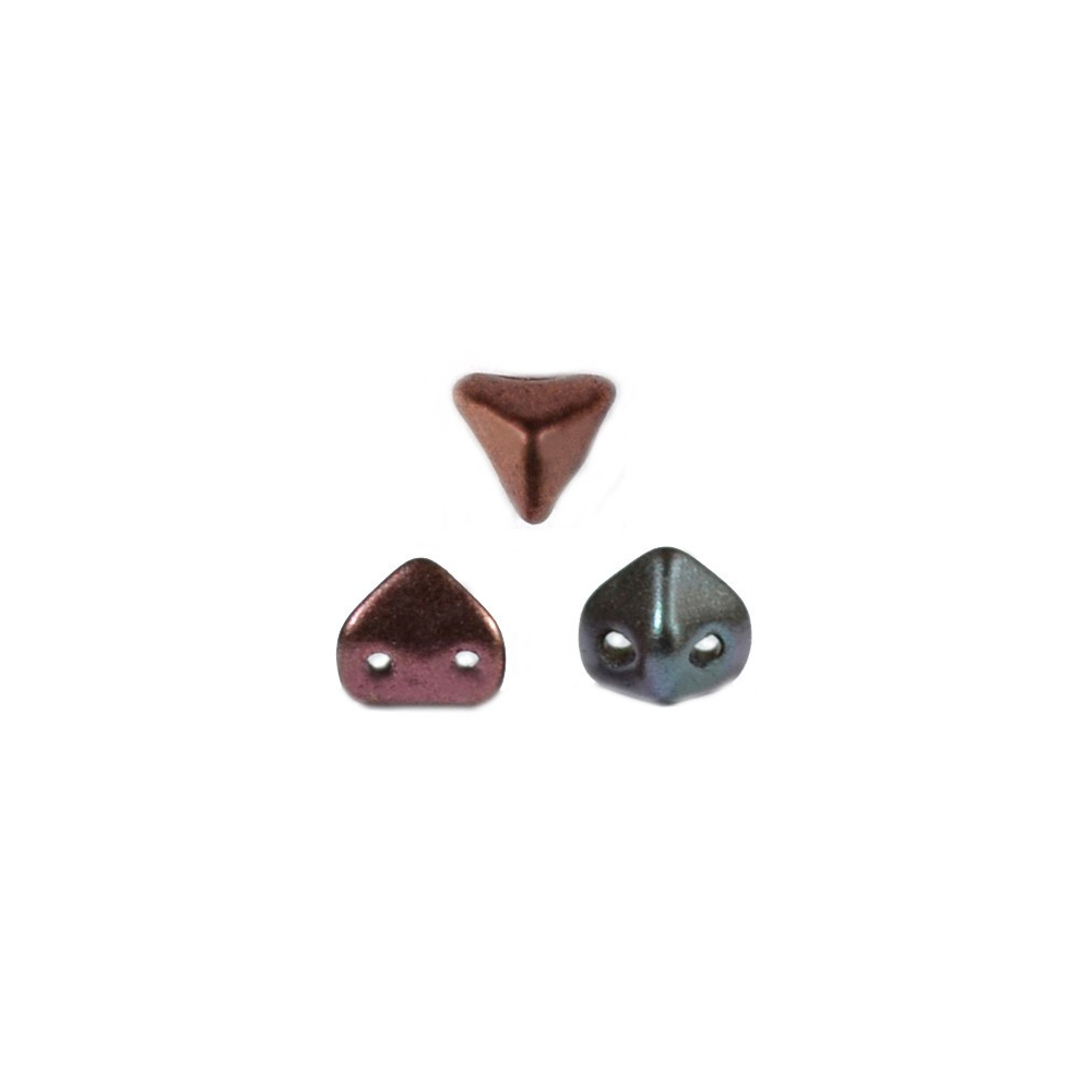 Bronzově zlatý odstín s irisovými odlesky definuje Super-Kheops® par Puca® o rozměru 6 x 6 mm, které představují precizně lisované dvoudírkové korálky z kvalitního českého skla. Jejich unikátní trojúhelníkový tvar s 3D profilem umožňuje tvůrcům vytvářet komplexní geometrické struktury a mandaly, přičemž dva paralelní otvory o průměru 0,8 mm zaručují stabilitu šitého šperku a hladký průchod nitě. Tento design, navržený renomovanou francouzskou designerkou Annick Puca, v sobě nese eleganci pařížského stylu spojenou s hlubokou tradicí českého sklářství a je plně kompatibilní s dalšími tvary jako Amos® par Puca®.