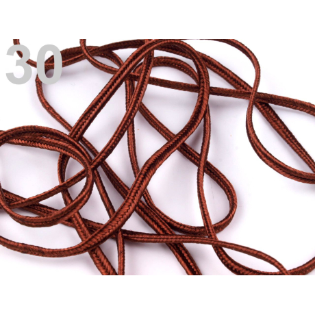 Šňůrka saténová 2 mm Průměr: 2 mm Balení: 5 metrů Barva: hnědá Materiál: Nylon Původ: Čína