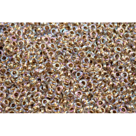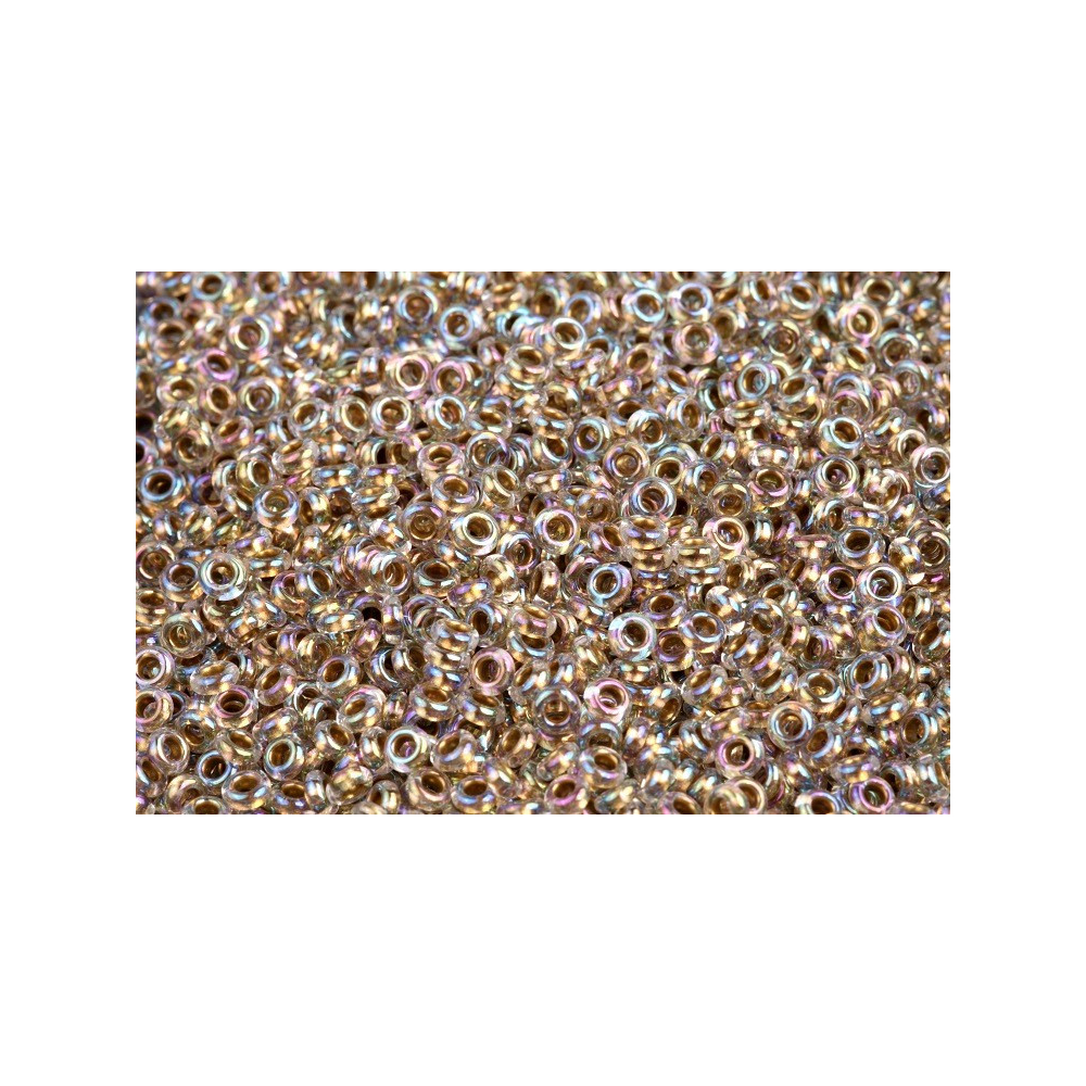 Crystal/Gold-Lined s jemným perleťovým leskem představuje unikátní variantu japonského rokajlu, která do vaší tvorby vnese hloubku a sofistikovanost. Tyto skleněné korálky typu TOHO Demi Round 8/0 se od klasického kulatého rokajlu liší svým zploštělým tvarem, který dosahuje přibližně poloviční výšky oproti standardním kuličkám. Právě tento nízký profil umožňuje vytvářet mnohem jemnější detaily a plynulé barevné přechody v plochých i prostorových vzorech, kde je kladen důraz na eleganci.