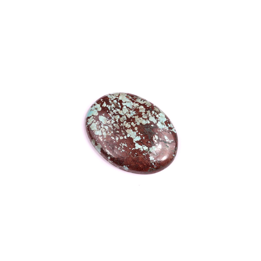 Kabošon z přírodního kamene Tyrkys Hubei je fascinujícím kouskem s bohatými odstíny modrozelené a červenohnědé, které dodávají každému kabošonu jedinečný, přírodní vzhled. Tento typ tyrkysu pochází z čínské provincie Hubei, kde se těží pro svou charakteristickou síťovou strukturu a syté barvy. Tyrkys Hubei je ceněn mezi milovníky minerálů a šperkaři, neboť symbolizuje ochranu, klid a duchovní vyrovnanost.