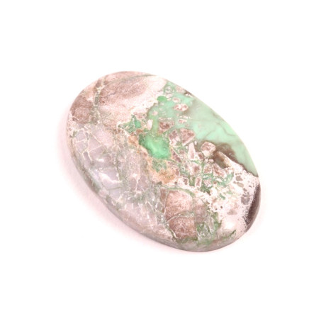 Kabošon z přírodního kamene Variscite představuje harmonickou kombinaci jemných zelených odstínů, které přecházejí do světlých a přírodních tónů. Tento minerál, ceněný pro svou klidnou energii a unikátní vzhled, patří mezi oblíbené volby šperkařů i sběratelů. Variscite se vyznačuje hladkou a lesklou povrchovou úpravou, která krásně zvýrazňuje jeho přirozené vzory a barevné nuance.
